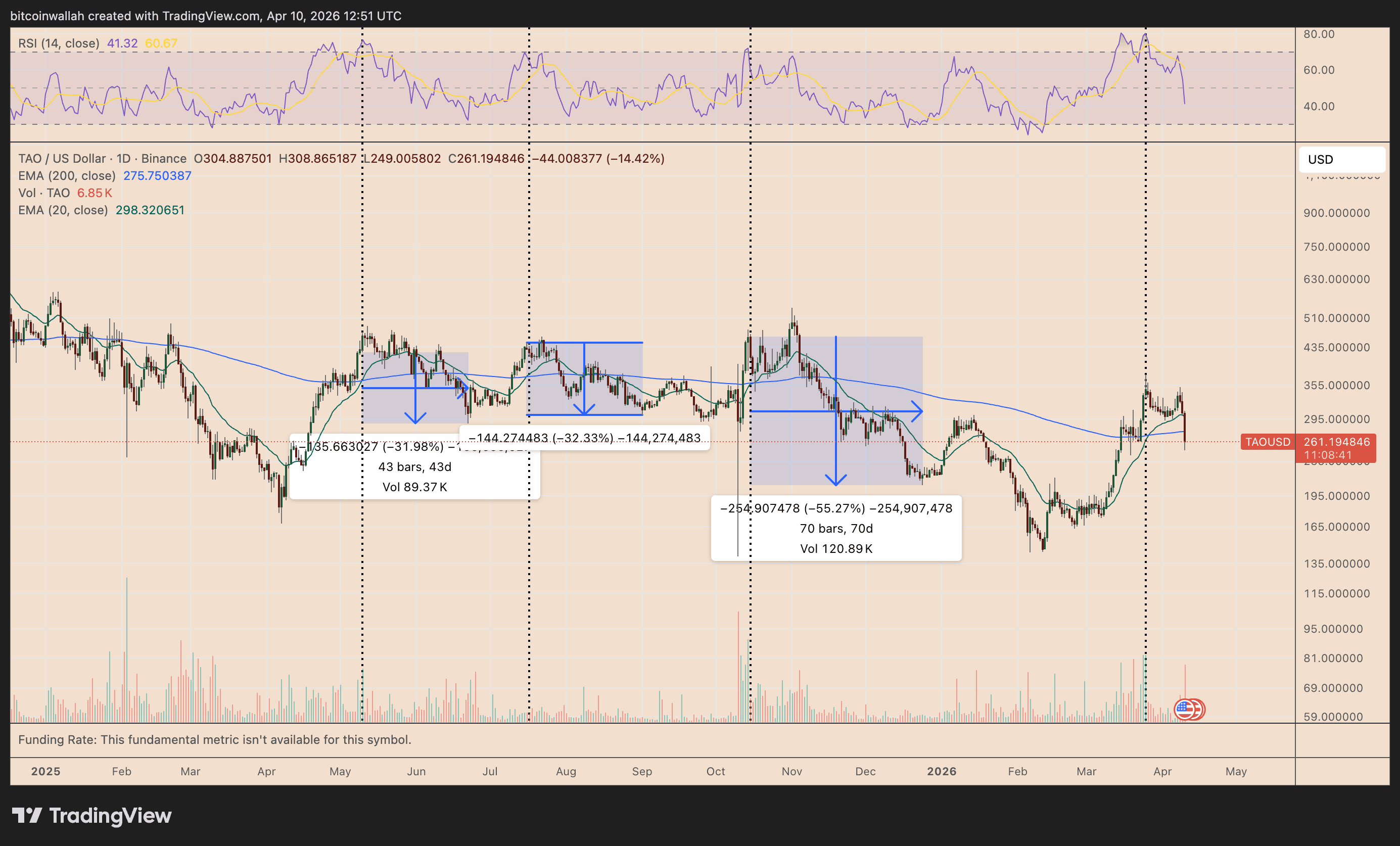 By Friday, the Bittensor token was moving toward that bearish setup’s projected target near $200, implying roughly 25% more downside from current levels.