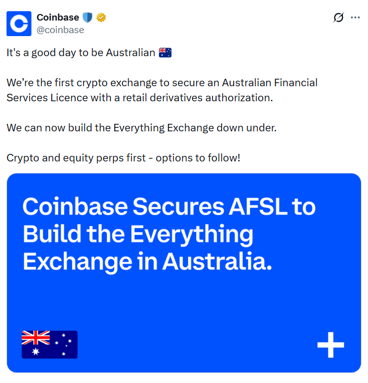 Global crypto exchange Coinbase said it is looking to expand its offerings in Australia to futures, options, stock trading, payments and other traditional finance products as part of an âeverything exchangeâ after securing a financial services license in the country.