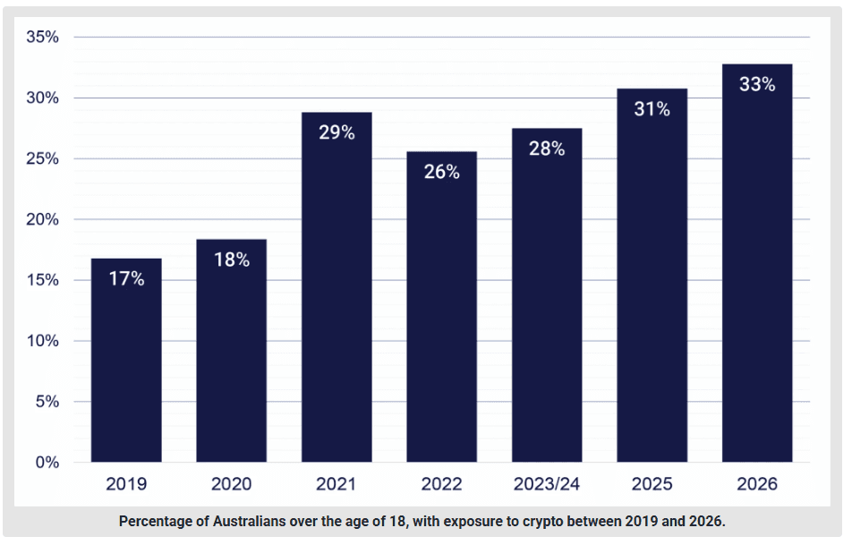 An estimated 33% of Australians had exposure to crypto in 2026. Source: Independent Reserve