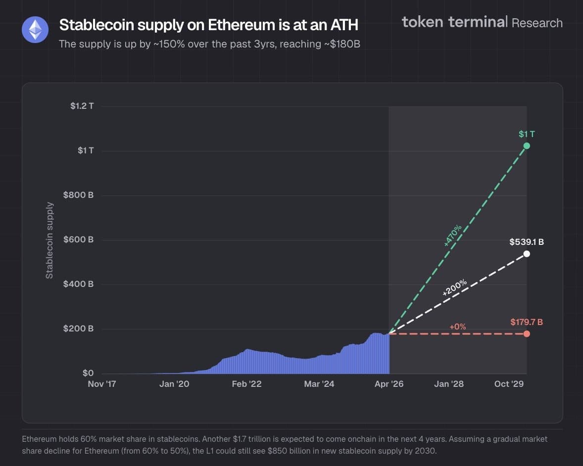 Projections for stablecoin growth on Ethereum. Source: Token Terminal